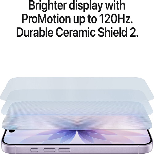 More delightful. More durable. 6.3-inch ProMotion display, Ceramic Shield 2, all 48MP rear cameras, Center Stage front camera, A19 chip and more.